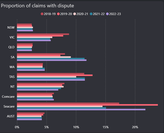 From the perspective of injured workers, disputation rates are important. These are the frequency with which the insurer disputes a claim and refuses to pay. Once again, Queensland is well ahead of its peers.