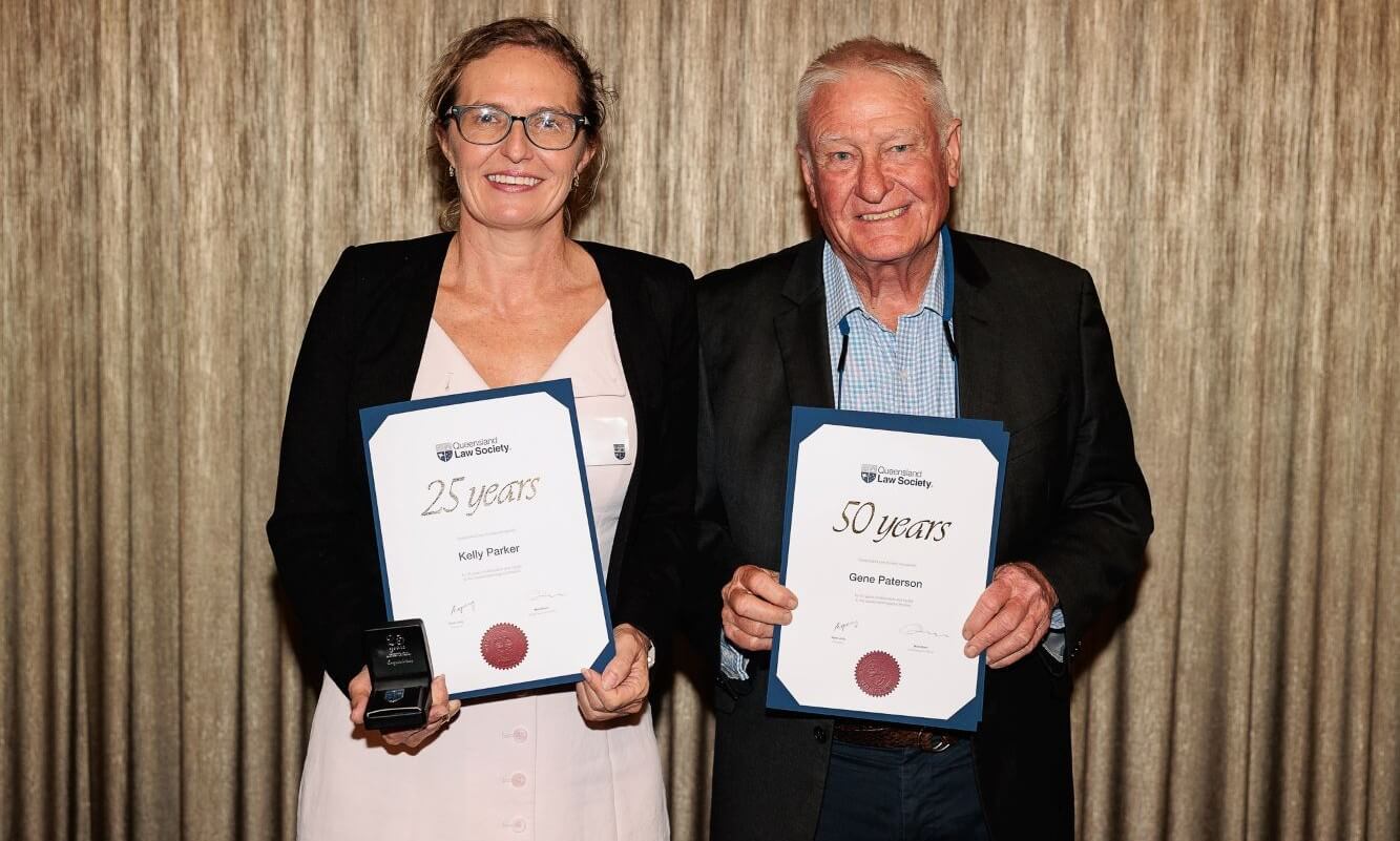 Mackay lawyers Gene Paterson and Kelly Parker celebrated their career milestones at a recent QLS event.